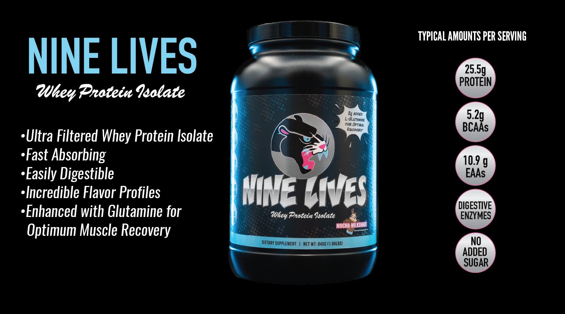 A Whey Isolate like NINE LIVES starts with a rigorous filtration process that isolates the protein from any excess fat, carbohydrates, cholesterol, and lactose, creating an ultra-pure end product. As a result, Whey Protein Isolate has less fat, cholesterol, carbohydrates, lactose and calories than any other form of protein supplementation on the market.